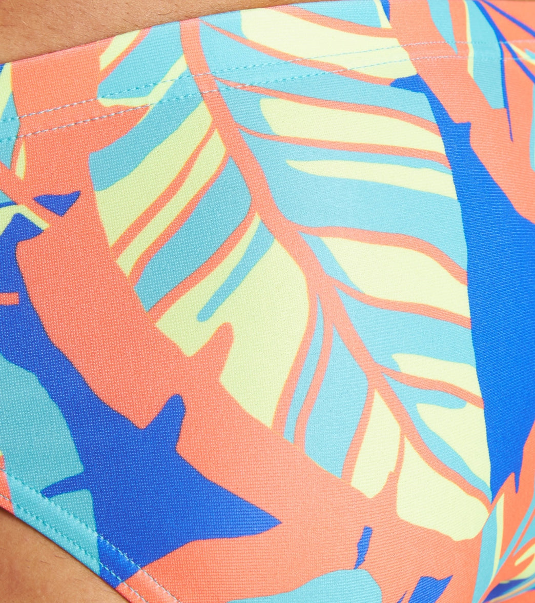 Swim and train in a bold. colorful new style in the arena Men's Tropicals Brief Swimsuit. built with MaxLife fabric for durability and a fit that lasts. day after day.