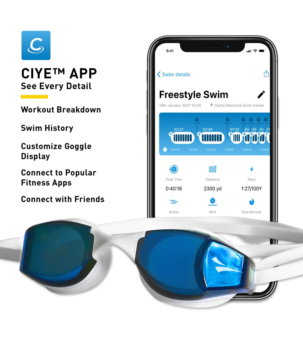 The Smart Goggle. Powered by Ciyeâ„? is designed to help swimmers improve and meet their fitness goals. The in-goggle display and activity tracker gives real-time feedback to help you track your distance and time allowing you to get the most out of your swim. Once you're out of the water. the app provides an in-depth analysis of your workouts. logs your history. and allows you to connect with friends and fitness apps.