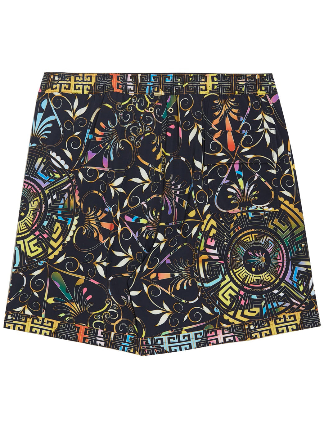 Choose a timeless swim style. featuring classic silhouettes and signature embroideries of the Johnny Was Men's Floral Peace Swim Trunk.