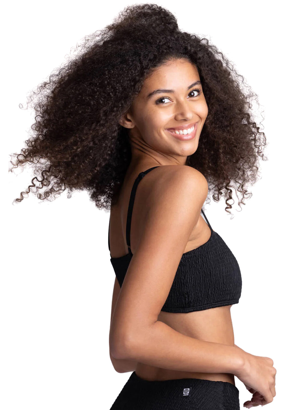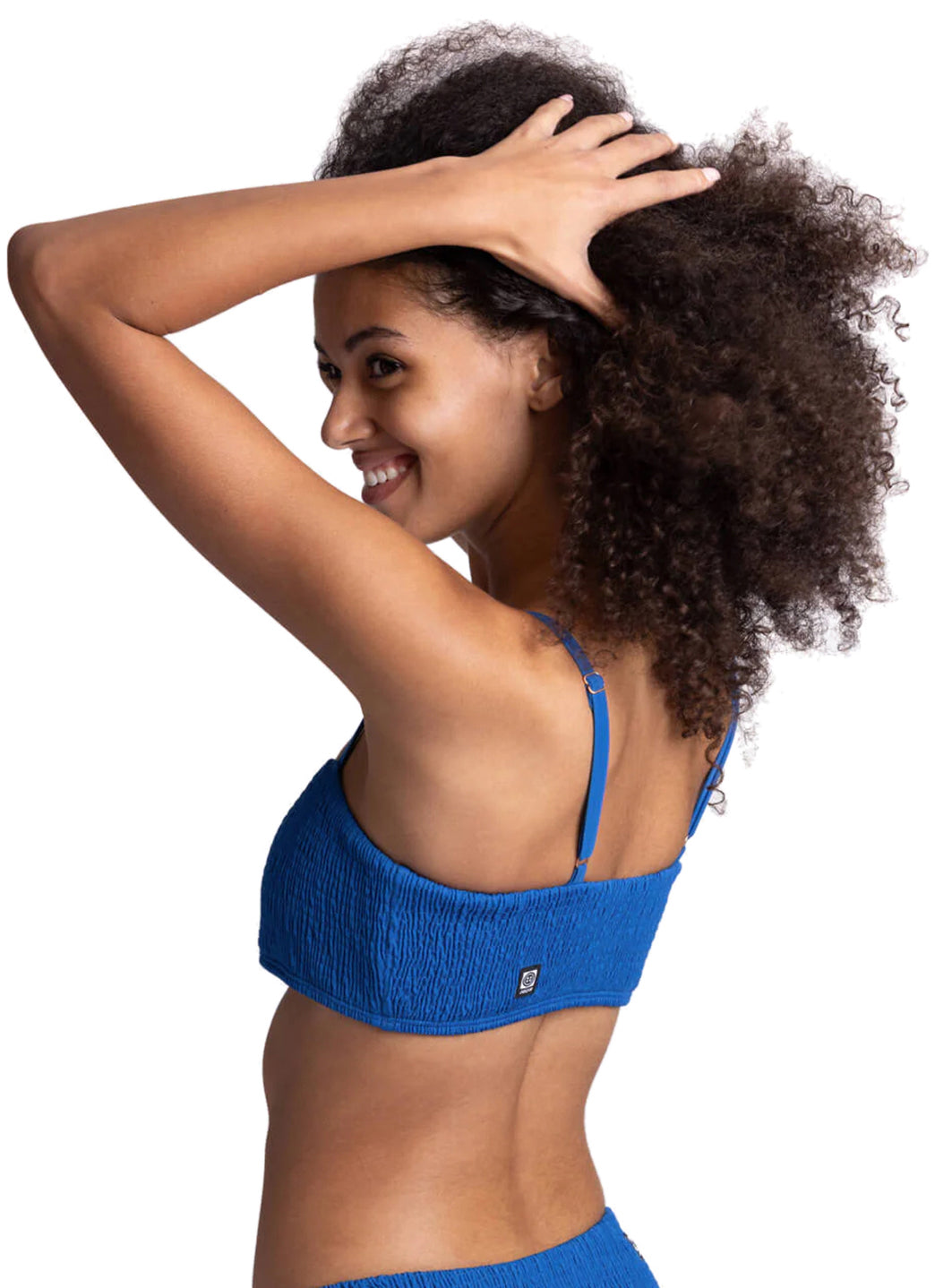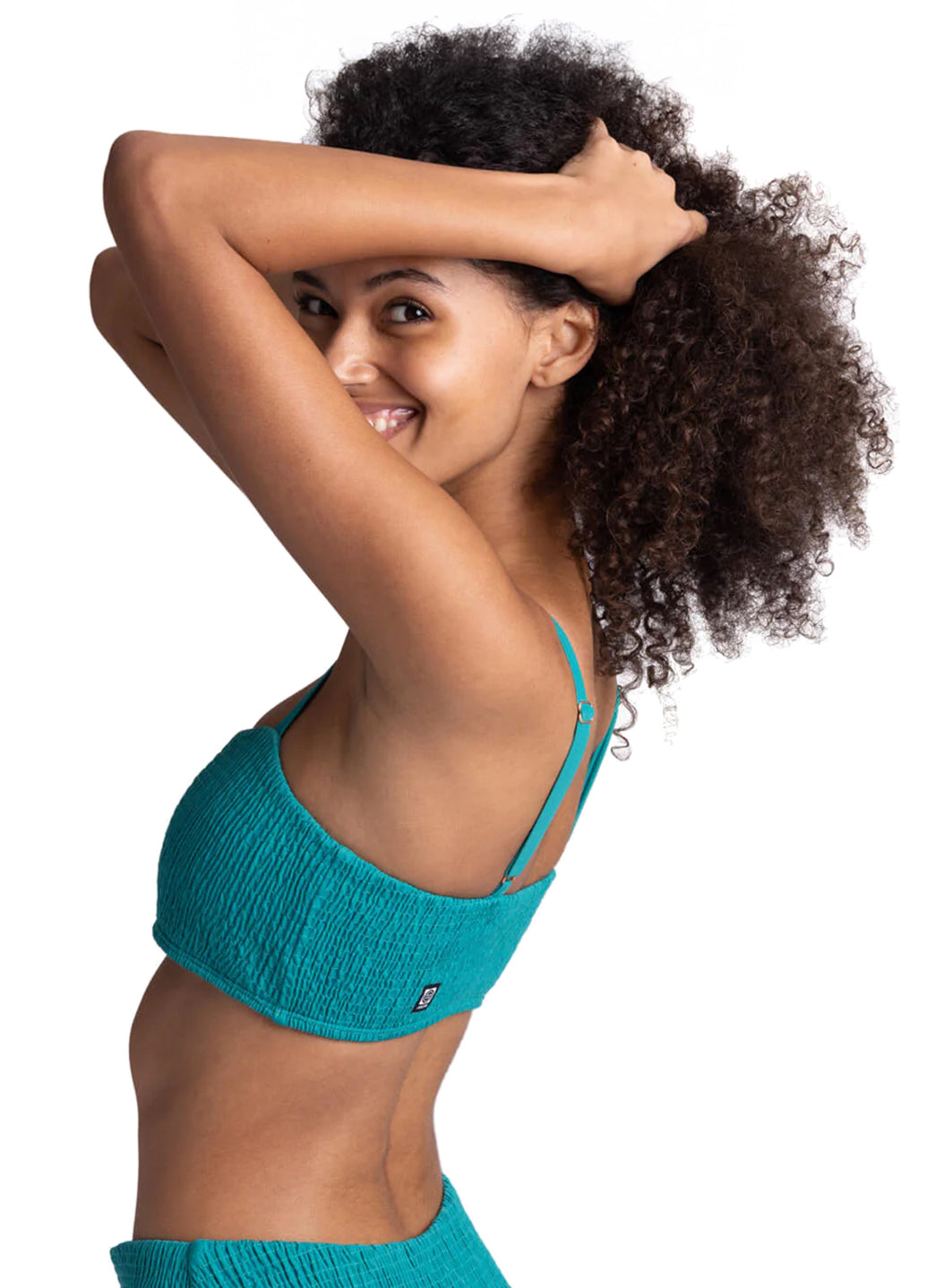 Embrace poolside elegance in the JOLYN Women's Eva Solid Smocked Bikini Top. a look that redefines comfort with its adjustable and smocked design.