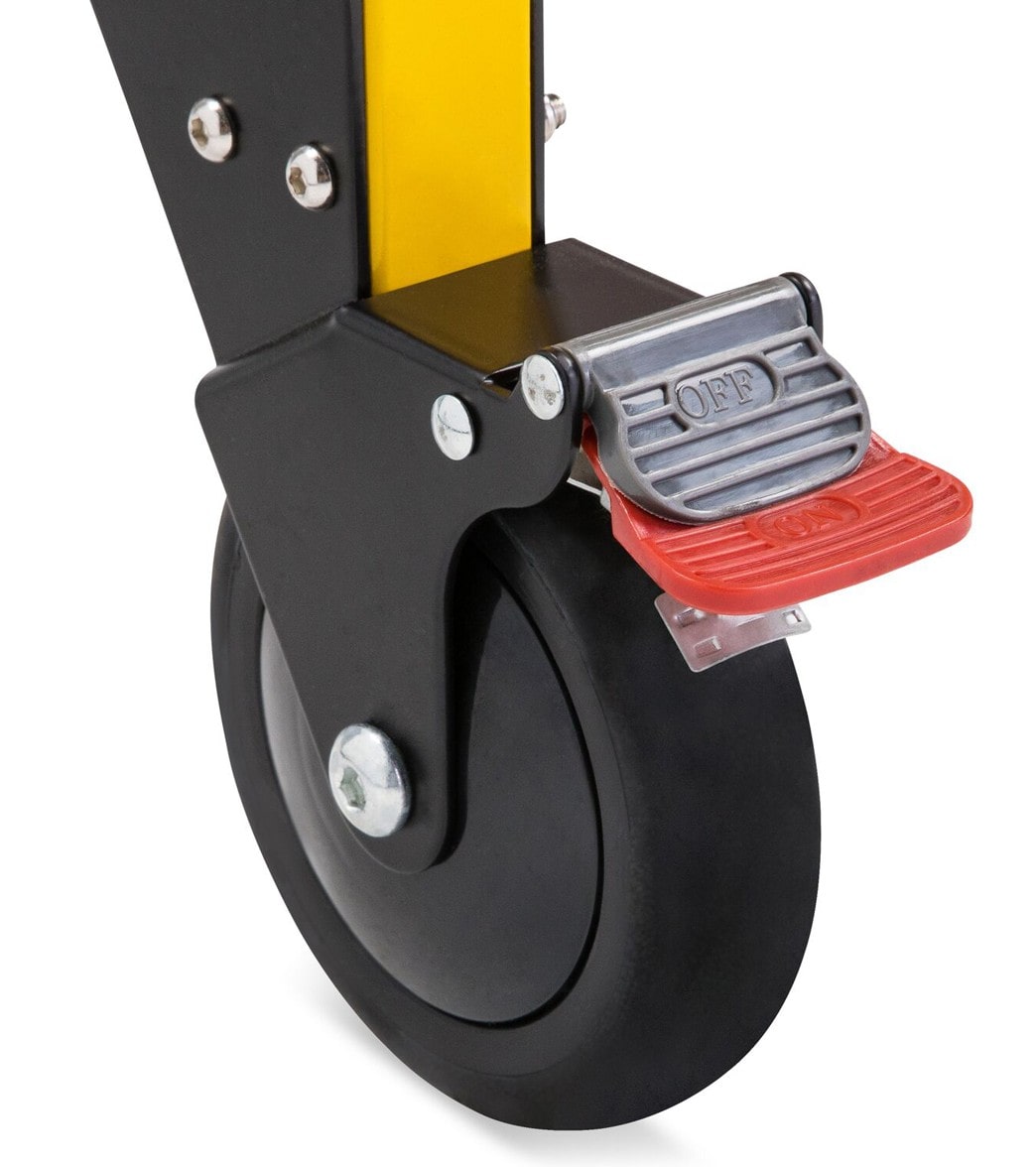 - 2â€?Heavy Duty cross-body safety restraint. 2â€?Lower leg safety strap. 4 ½ â€?Rear wheels for smoother transportation.