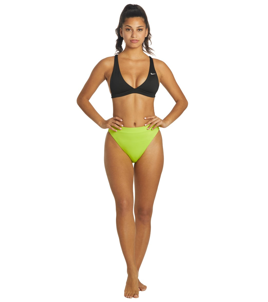 The Nike Women's Essential High Waisted Bikini Bottom features a high-rise waist that offers a comfortable. supportive feel. Minimal bottom coverage with a high-leg cut that sits above the hips lets you move with limited distractions. This product is made with at least 75% recycled polyester fibers.