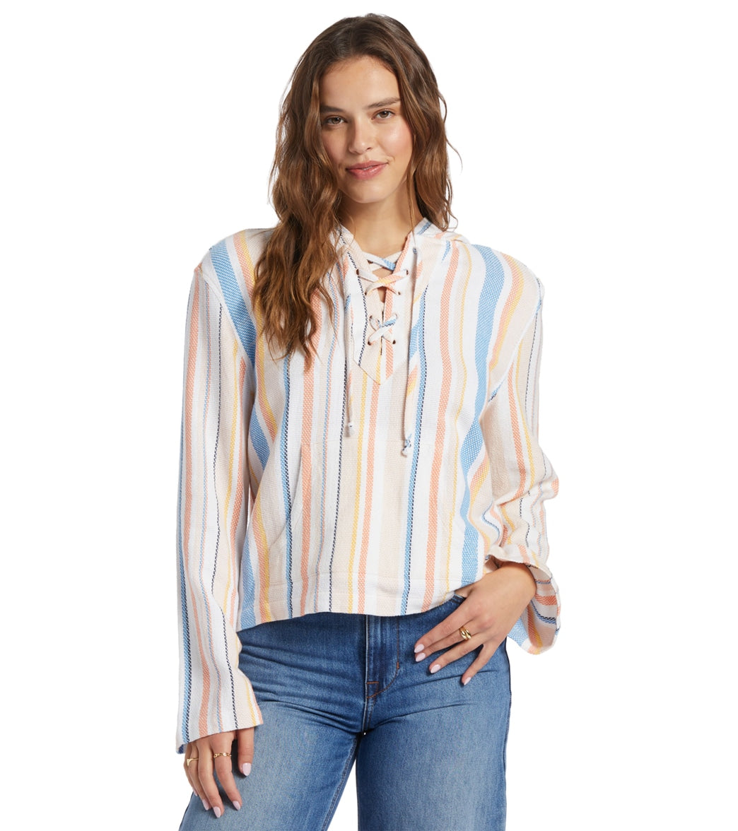The Roxy Women's Cabo Trip Pullover Hoodie is crafted from durable cotton basketweave fabric with a striped print in a bold mood indigo blue. Complete with bell sleeves and a kangaroo pouch pocket.