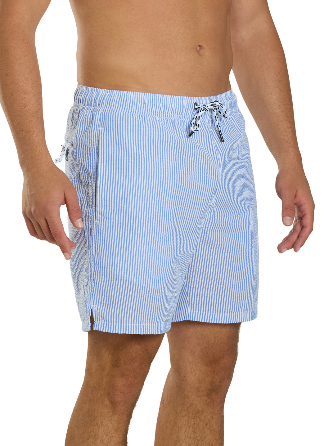 For dads ready to match their little sailors. these men's swim shorts offer the same stylish Parisian seersucker stripes and comfort features. They come with a navy/white fleck drawcord. side pockets. and a secure white zippered back pocket