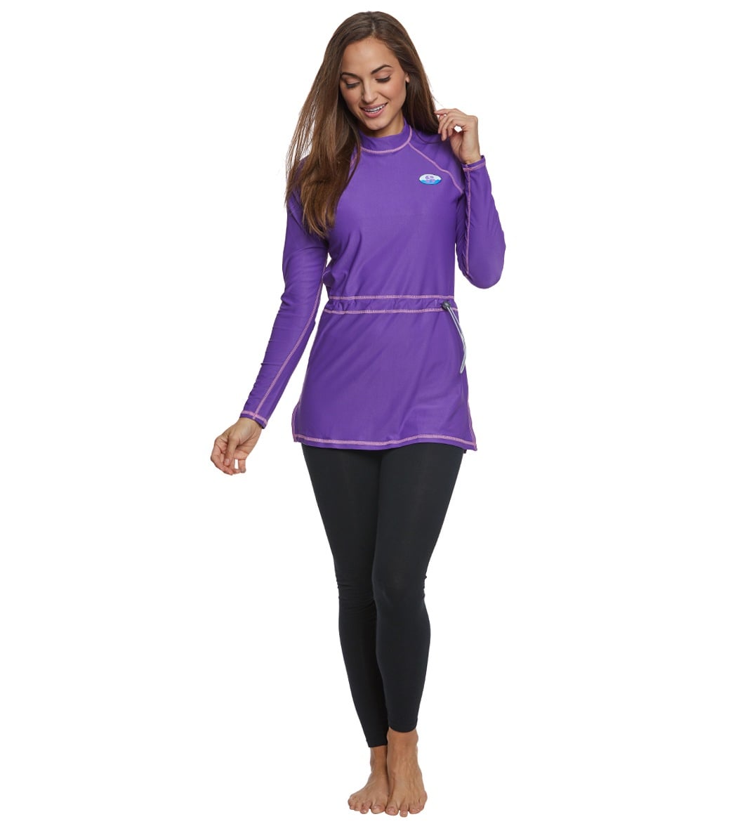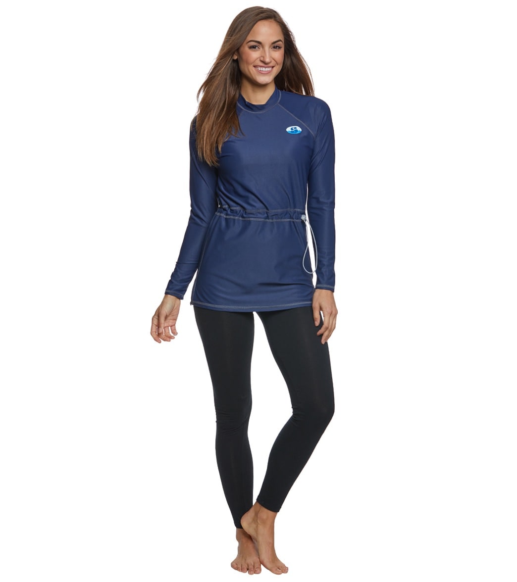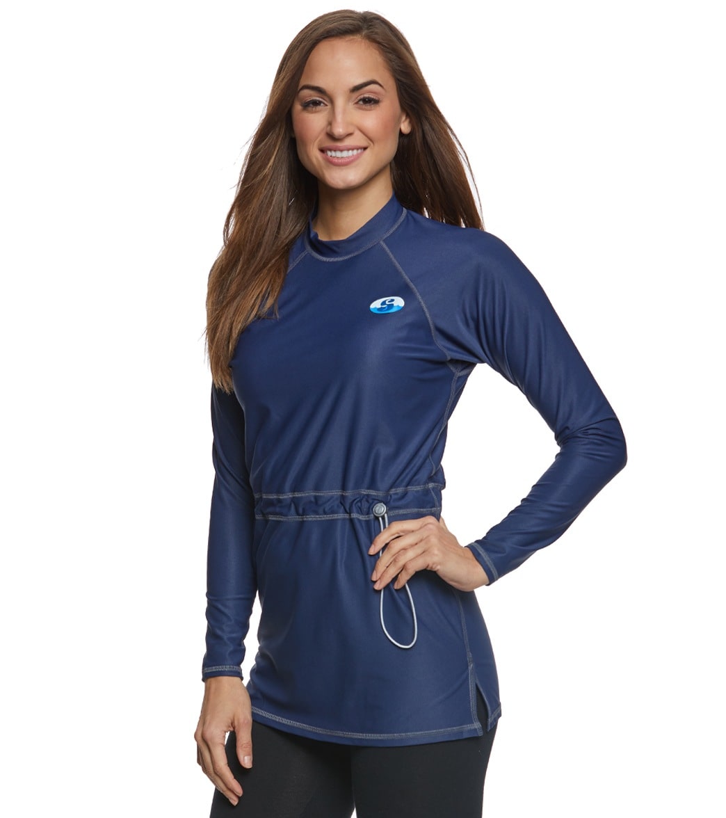 Perfect for in and out of water wear. the Resort Shirt top has a shock cord waist. which is tightened to prevent riding up in the water and loosened for a more modest look out of the water.