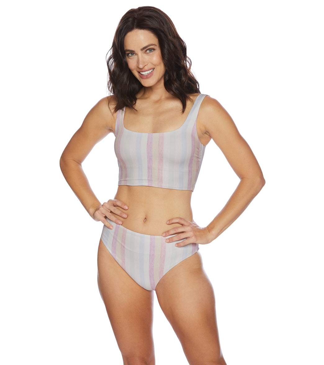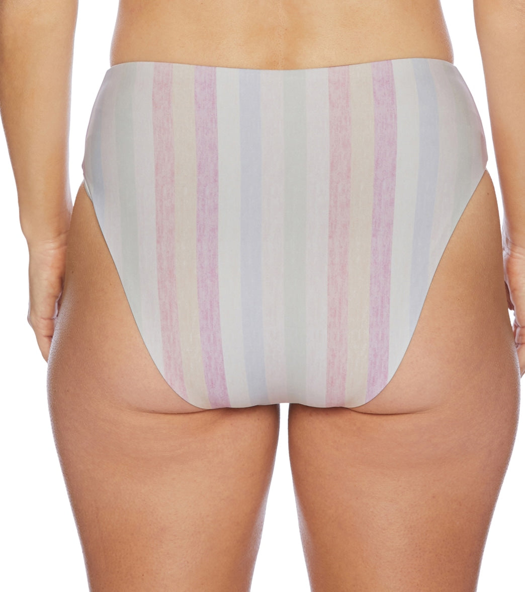The Splendid Swim high waist pant has a soft clean finish waist edge that sits above the hips with moderate seat coverage. This bottom's high leg creates a contemporary and proportionate look in a super soft heathered carnival stripe print.