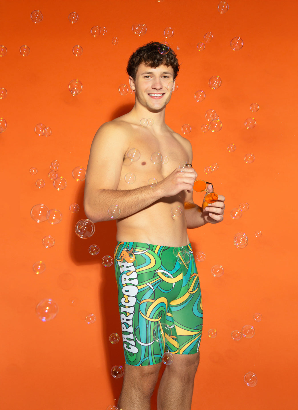 Embrace the power of the stars wearing the Sporti Groovy Zodiac Capricorn Jammer Swimsuit. This suit offers a customizable drawstring waist. a comfortable front lining. and flat seams to reduce chafing. The jammer style provides the most coverage amongst men's style suits. Let your horoscope guide your strokes to be smooth and powerful throughout your laps.