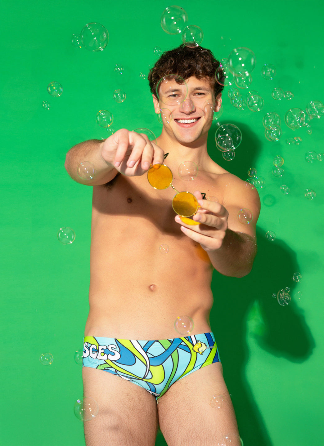 Embrace the power of the stars wearing the Sporti Groovy Zodiac Pisces Brief Swimsuit. This suit includes an adjustable drawstring waist. a comfortable front lining. and flat seams to reduce chafing. The brief style provides minimal coverage. effectively reducing tan lines and maximizing movement. Let your horoscope guide your strokes to be smooth and powerful throughout your laps.