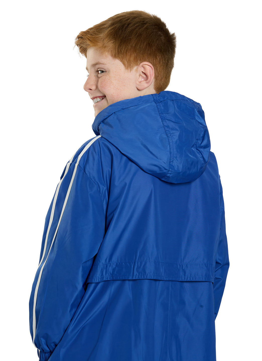 Stay warm and dry all season long in this cozy Sporti Comfort Fleece-Lined Swim Parka Youth. With the littles in mind. the plush lining offers ultimate warmth and the water-resistant fabric repels water to keep kids warm and dry on the coldest days. It features a large mesh vent with velcro closure for breathability. Multiple pockets offer a variety of storage options for caps. goggles and more! The large back panel is perfect to customize with your team logo and both arms feature double striped sleeve detail.